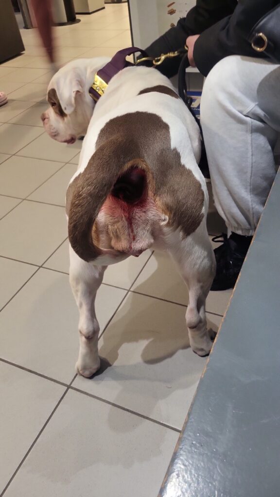 Ihr Körper erzählt diese Vergangenheit deutlich. Ein vernarbtes Gesicht, eine große Narbe vom Schädel über die Stirn bis kurz vorm Stopp, fehlgewinkelte Gliedmaßen, offene und entzündete Hautstellen, eine Vulva die dauerhaft geschwollen ist, angegriffenes Zahnfleisch und ein insgesamt massiv geschwächter und dünner Allgemeinzustand. Es ist das Bild eines Organismus, der über lange Zeit funktionieren musste, während seine Grenzen dauerhaft ignoriert wurden. Haben sie überhaupt jemals gezählt? Die Frage die wir uns stellen ist, warum man mit so einen deformierten Hund überhaupt Welpen in die Welt setzt?